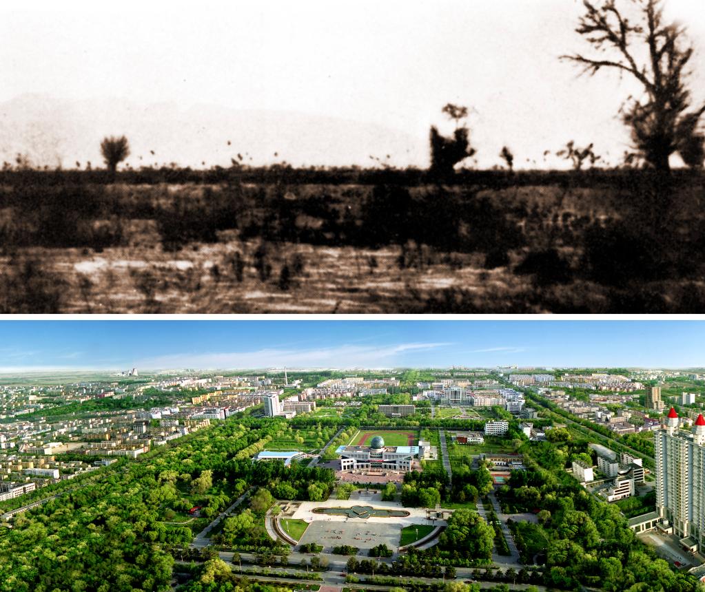 上图为20世纪50年代,石河子开发前的面貌(新疆兵团军垦博物馆提供);下图为石河子夏日美景(新疆生产建设兵团第八师宣传部提供)。新华社发