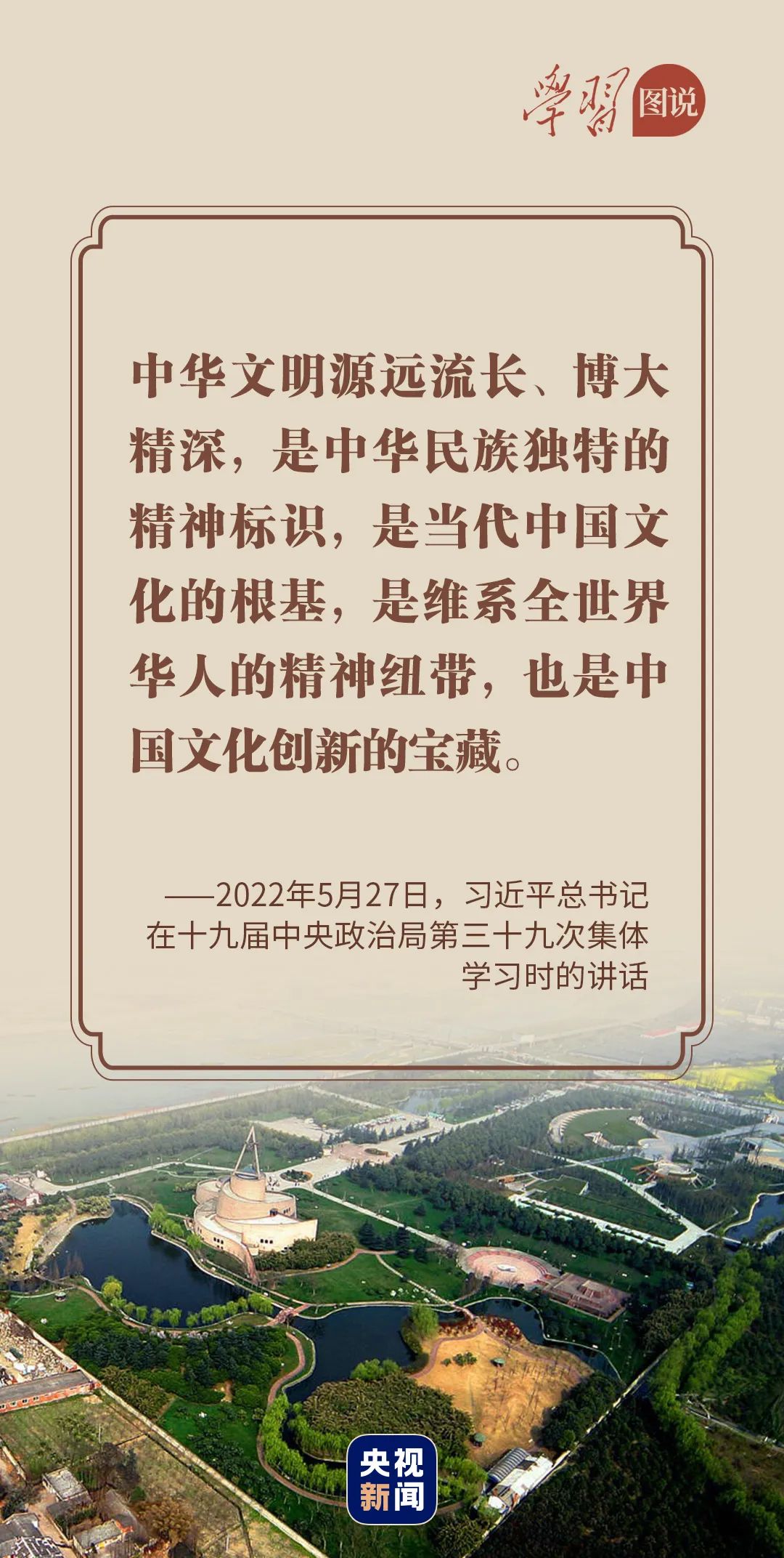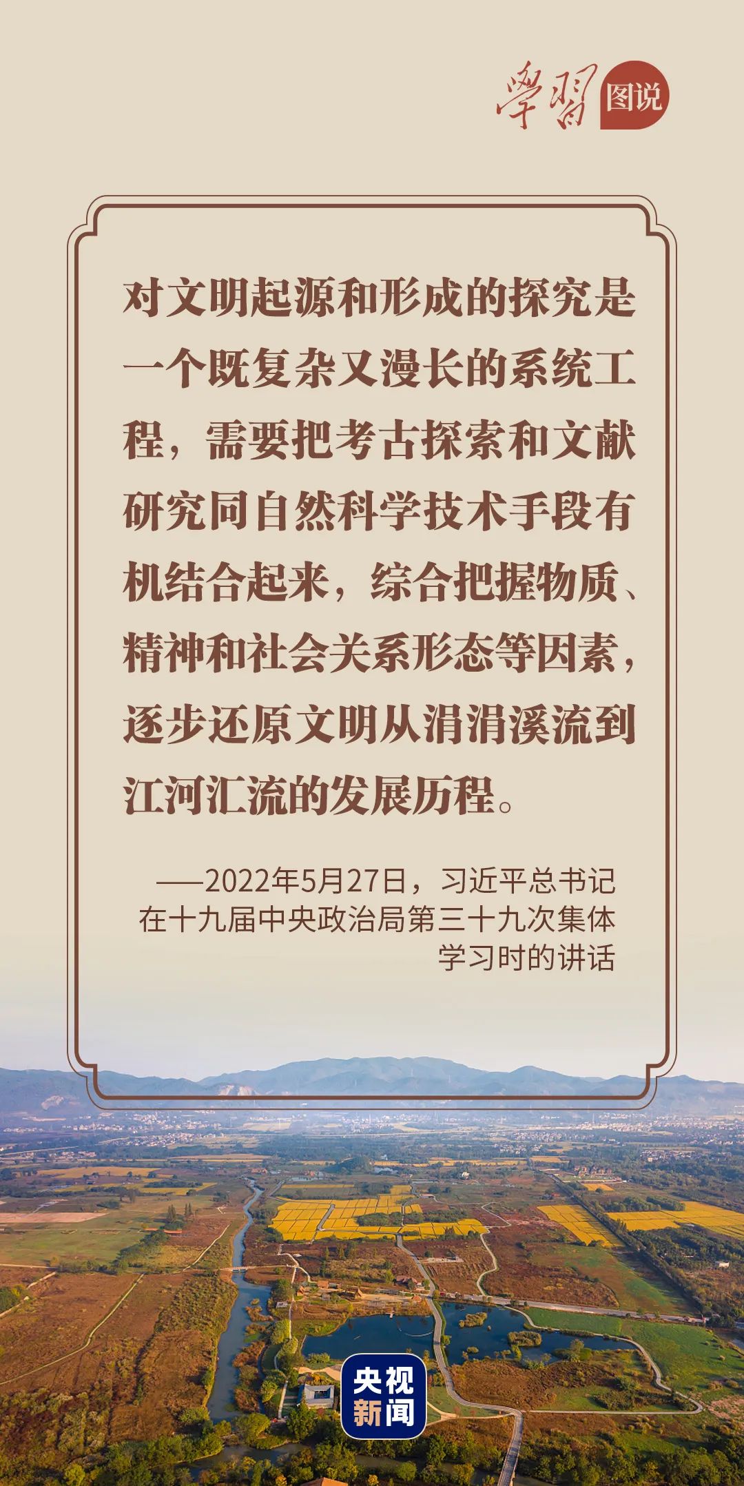 “深入了解中华文明五千多年发展史,推动把中国文明历史研究引向深入,推动全党全社会增强历史自觉、坚定文化自信,坚定不移走中国特色社会主义道路,为全面建设社会主义现代化国家、实现中华民族伟大复兴而团结奋斗。”