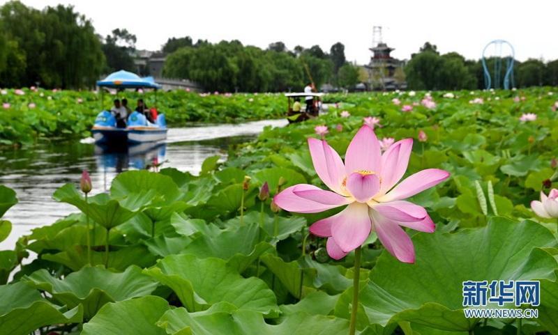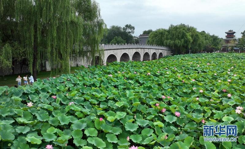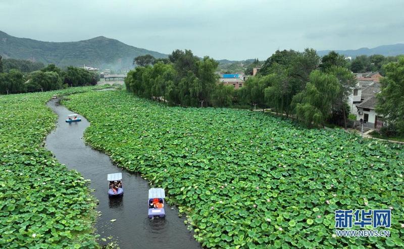 近日,秦岭深处的陕西省商洛市丹凤县棣花古镇荷花盛开,吸引游人前来观赏。(