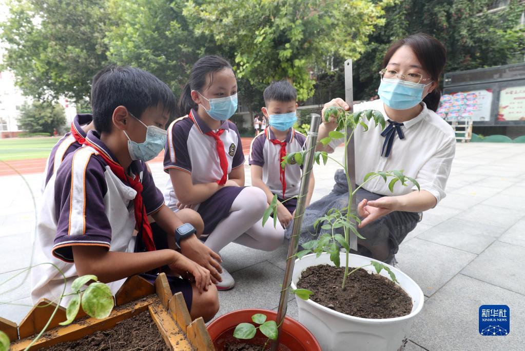 8月3日,在河北省石家庄市长安东路小学,老师(右一)为学生们测量太空种子植株。新华社发(梁子栋摄)