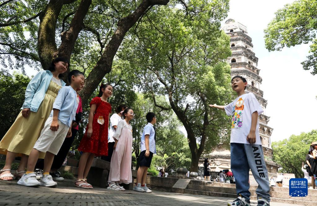 8月3日,在江苏苏州虎丘景区,一名孩子在体验“小小讲解员”上岗实践。新华社发(杭兴微 摄)