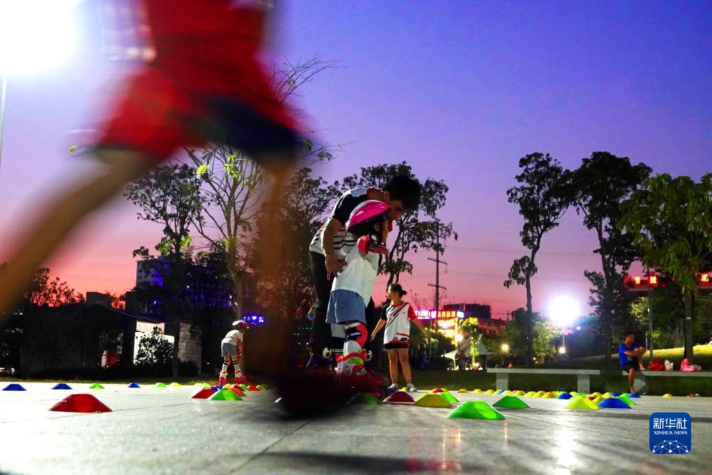 8月2日,在广西南宁市明月湖湿地公园,孩子们在教练的指导下进行轮滑训练。新华社发(喻湘泉摄)