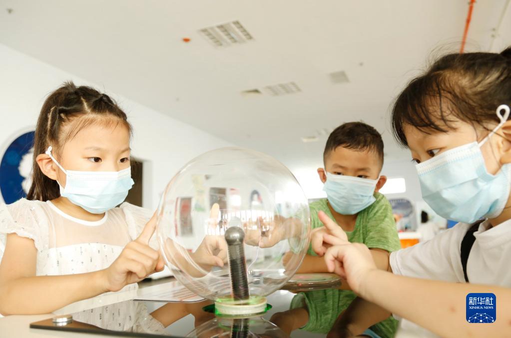 8月3日,在河北省邢台市南和区科技馆,贾宋镇南师村的孩子们在学习科普知识。新华社发(张驰摄)