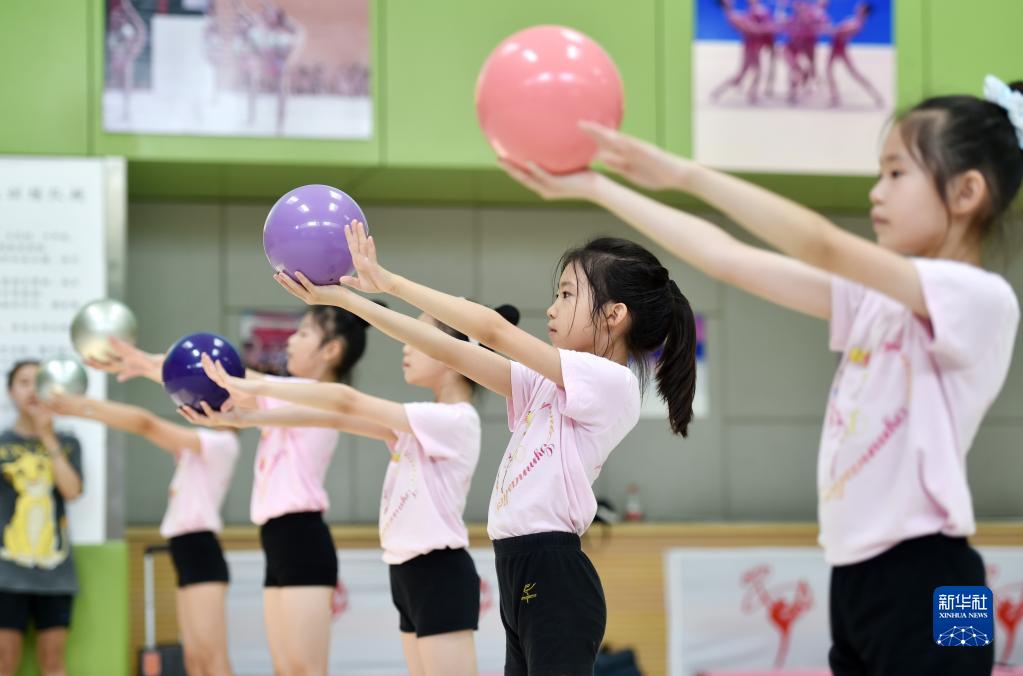 8月3日,在河北省石家庄市裕华区的一家体育训练馆,学习艺术体操的孩子们在刻苦训练。新华社发(张晓峰摄)