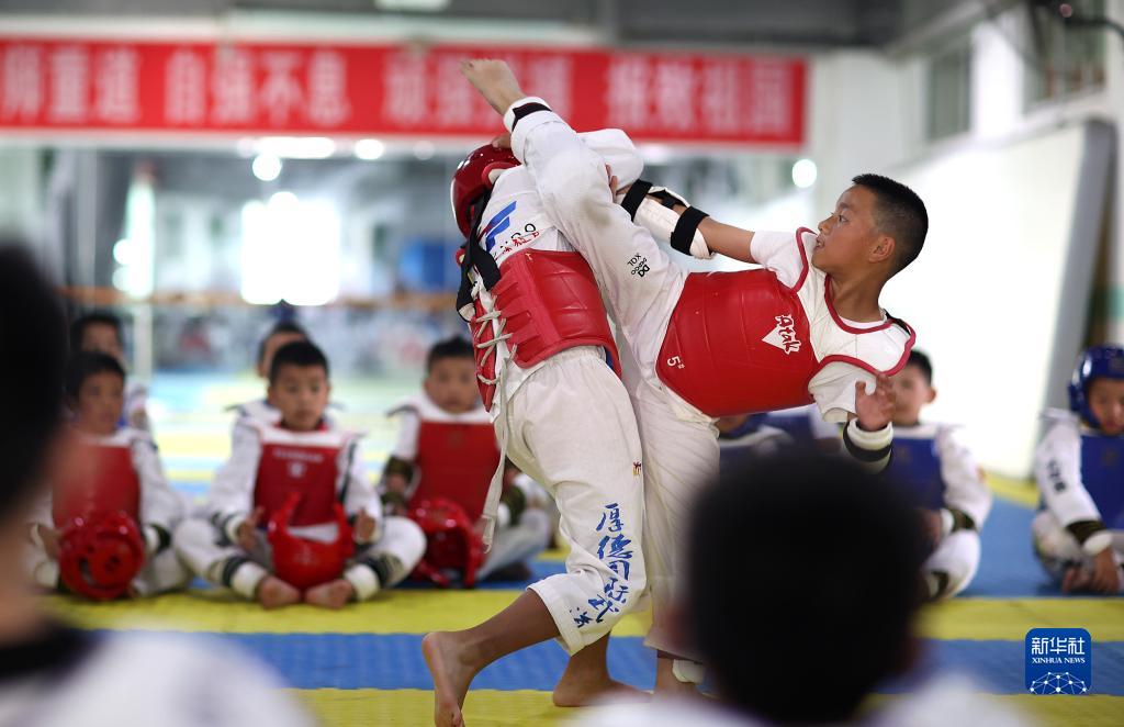 8月3日,孩子们在贵州省黔东南苗族侗族自治州丹寨县一家跆拳道馆练习跆拳道。新华社发(黄晓海 摄)