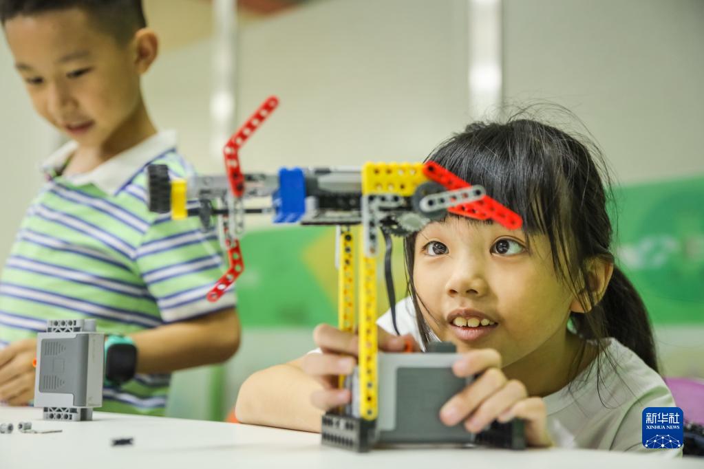 8月2日,在湖南省永州市蓝山县一培训学校,孩子们在体验机器人编程。新华社发(彭华摄)