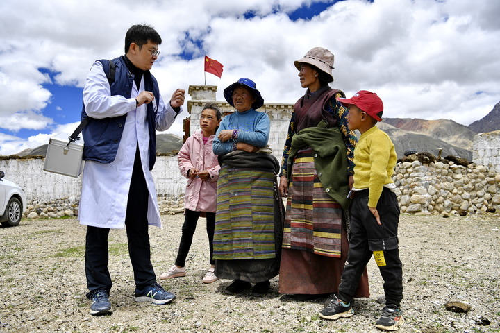 在西藏拉萨市当雄县格达乡格达村,第六批医疗人才“组团式”援藏专家王克明(左一)为村民讲解健康知识(2021年6月19日摄)。新华社记者 张汝锋 摄