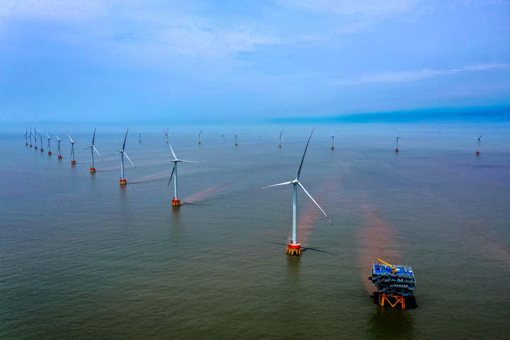 2021年5月16日拍摄的浙江舟山北部海域的中广核岱山4号海上风电场(无人机照片)。新华社发(姚峰 摄)