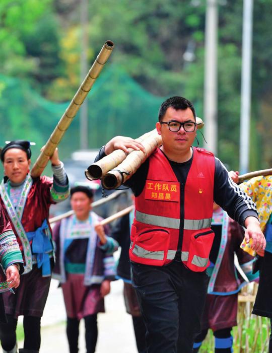 广西柳州市融水苗族自治县杆洞乡党鸠村脱贫攻坚(乡村振兴)工作队员郑昌昊和妇女们去劳动(2021 年 4 月 20 日摄)黄孝邦摄 / 本刊