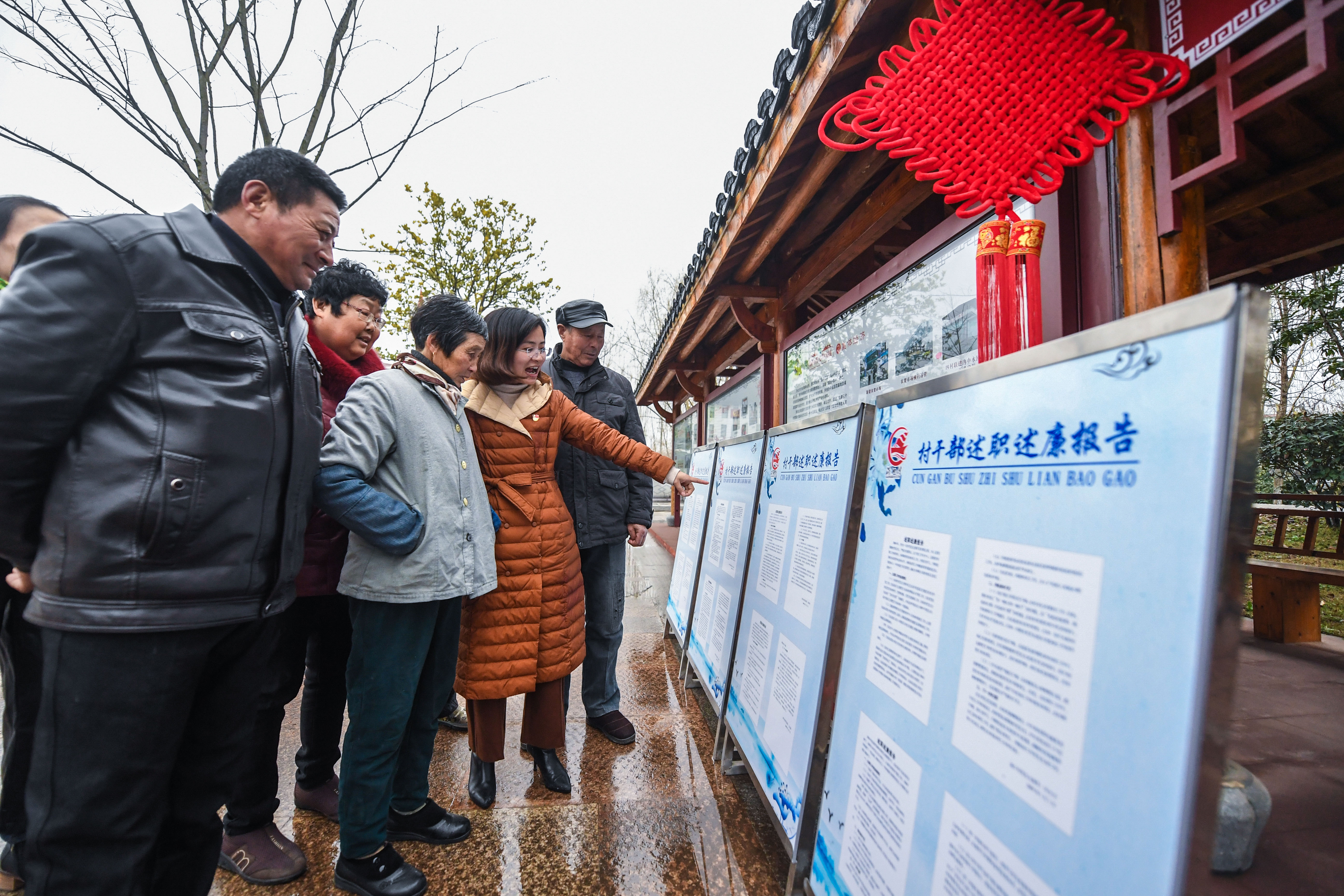 2019年1月15日,浙江省长兴县虹星桥镇港口村党总支委员(右二)向村民介绍2018年度村干部述职述廉情况,接受村民监督。新华社记者 徐昱 摄