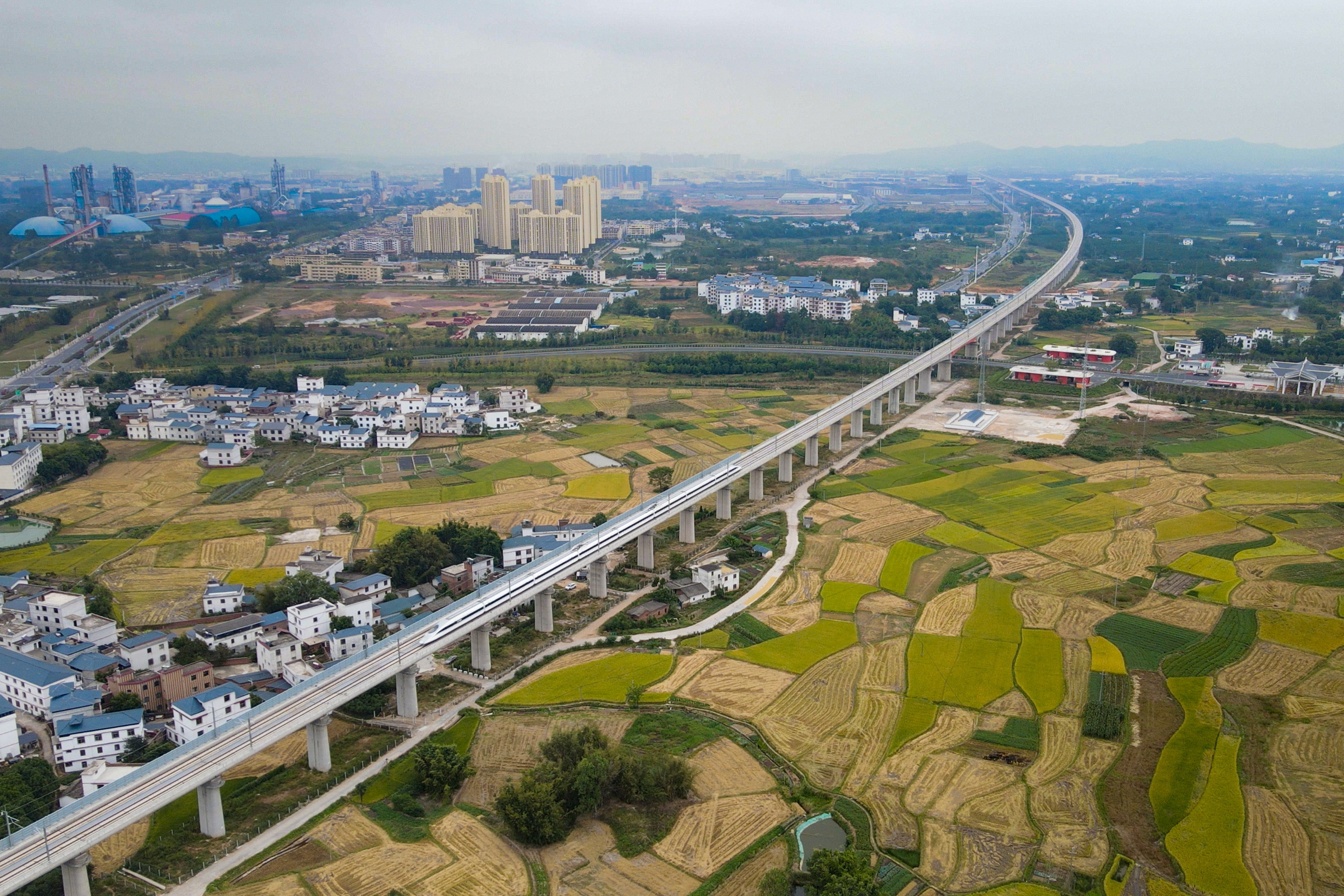 沐浴着秋日的阳光,赣深高铁线上一趟趟列车飞驰而过。