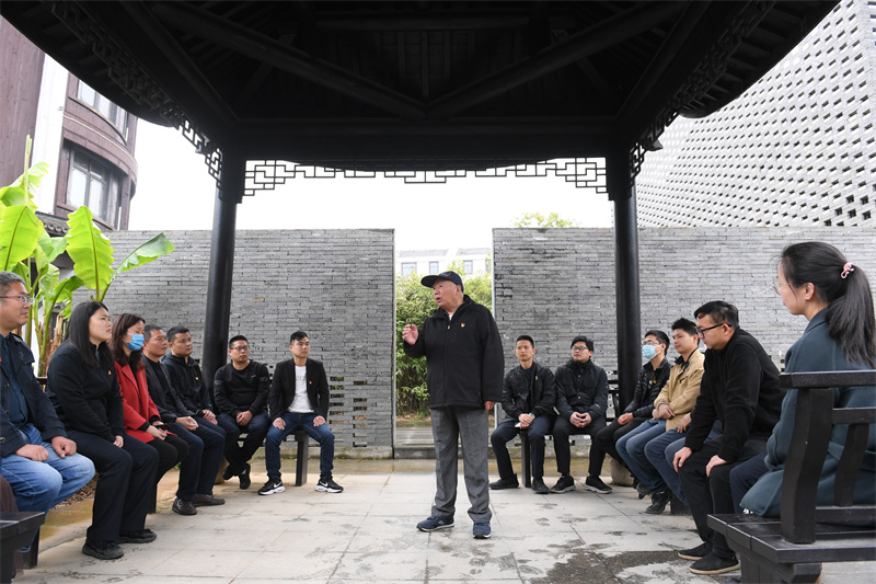 浙江诸暨枫桥镇魏廉村老党员魏杏根(中)在枫桥经验陈列馆的亭子内和年轻党员分享当年运用“枫桥经验”化解基层矛盾的故事(2021年4月11日摄)。新华社记者 翁忻旸 摄