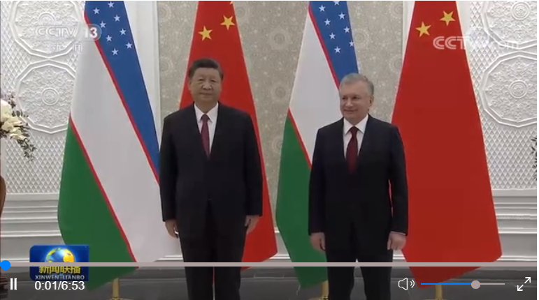 米尔济约耶夫为习近平举行隆重欢迎仪式。两国元首共同登上检阅台,军乐团奏中乌两国国歌。习近平在米尔济约耶夫陪同下检阅仪仗队。两国元首分别介绍各自陪同人员,并共同观看分列式。
