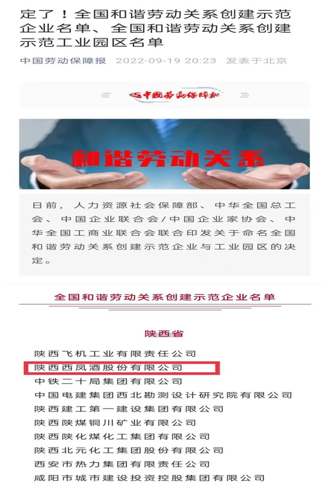 西部决策网讯(记者艾米杰 韩宗宪 通讯员 许凡 张天立)为树立示范典型、弘扬人文关怀、传递和谐温暖,进一步推动广大企业深入开展和谐劳动关系创建活动,促进构建中国特色和谐劳动关系。近日,人力资源和社会保障部、中华全国总工会、中国企业联合会/中国企业家协会、中华全国工商业联合会联合印发《关于命名全国和谐劳动关系创建示范企业与工业园区的决定》,陕西西凤酒股份有限公司榜上有名,荣获“全国和谐劳动关系创建示范企业”称号。