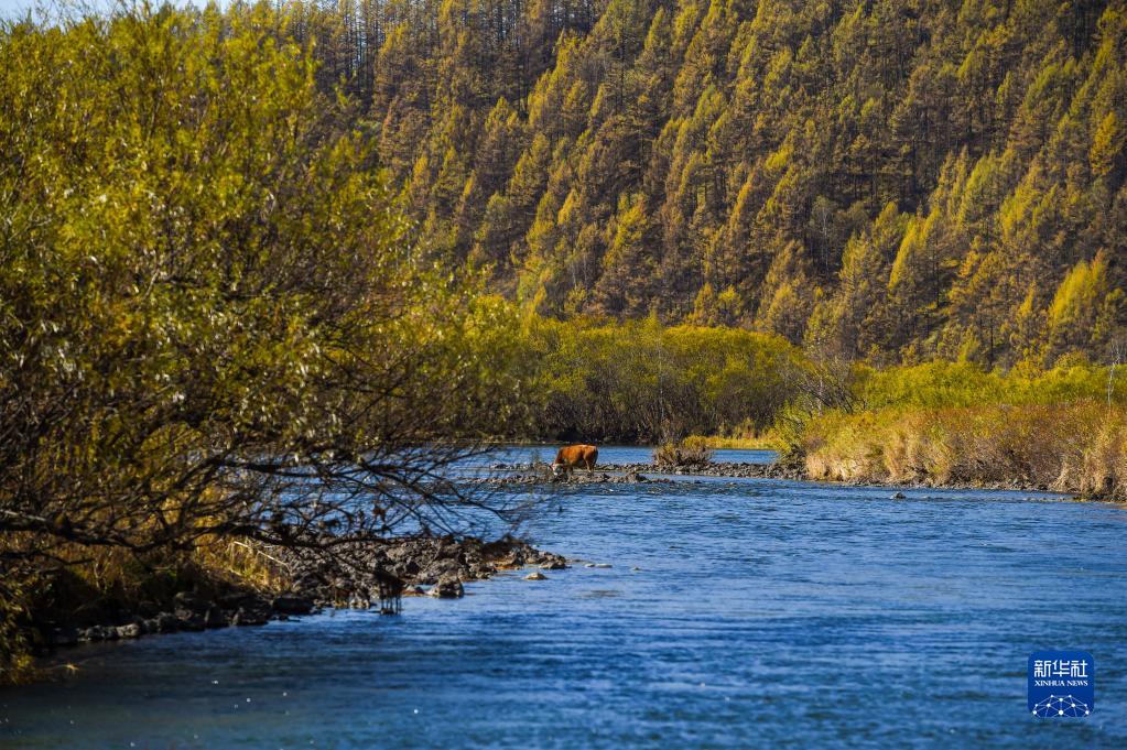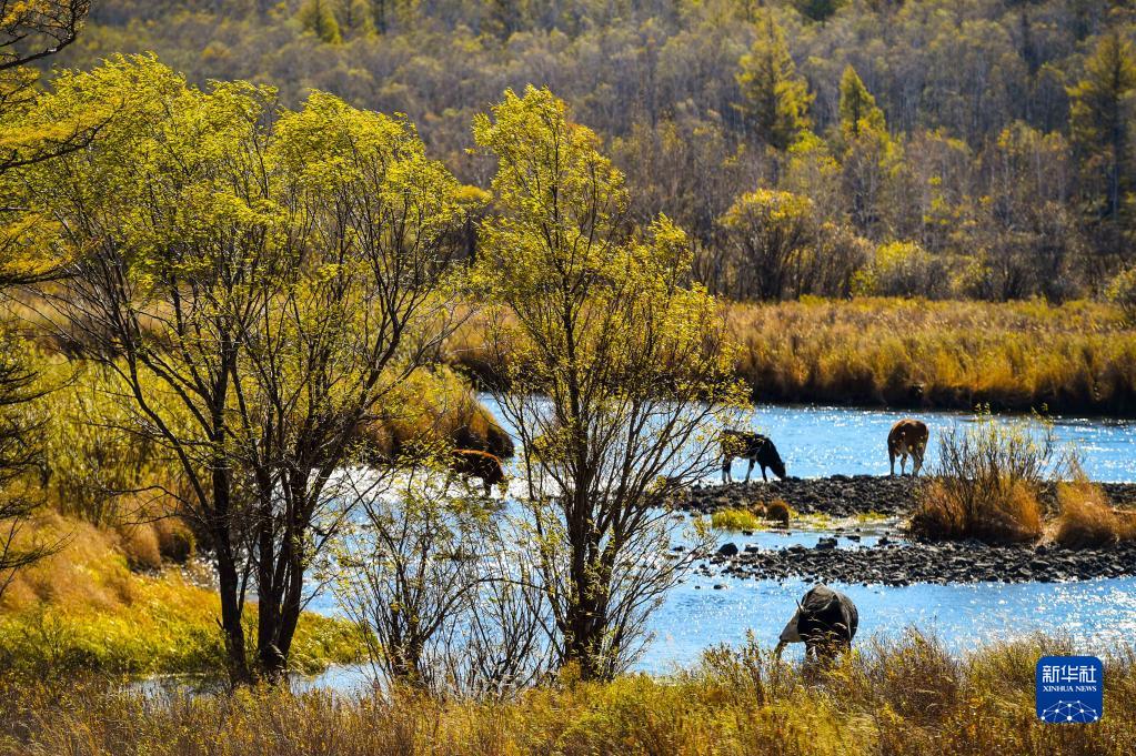 9月21日,牛群在阿尔山国家森林公园内的河岸边觅食。新华社记者 彭源 摄