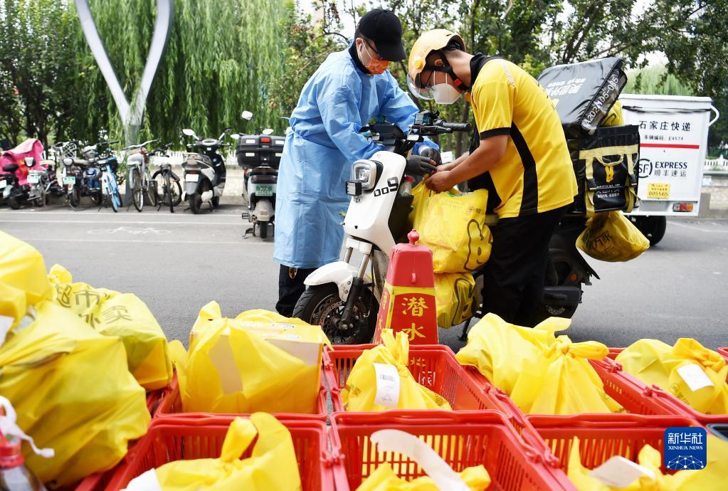在河北省石家庄市裕华区一家超市保供点,外卖人员在打包,准备为市民送货(2022年8月30日摄)。新华社记者 杨世尧 摄