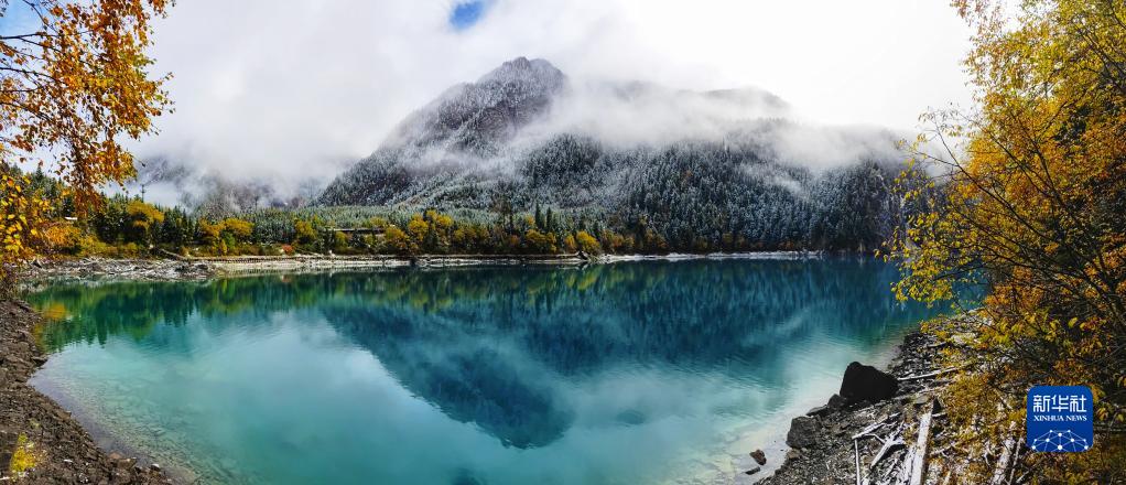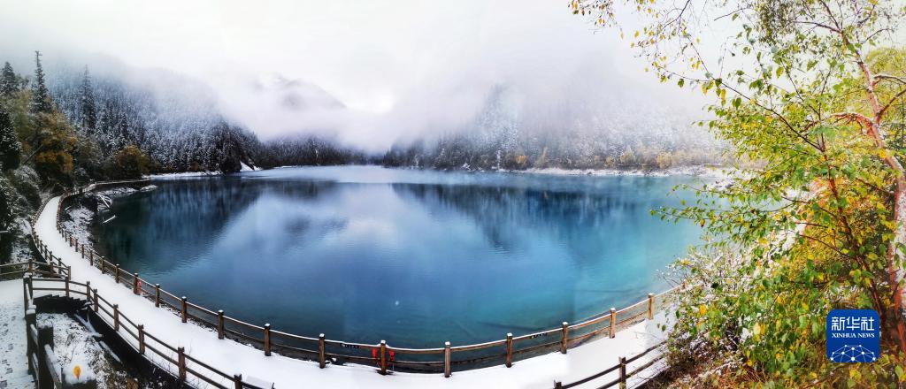 这是10月7日在世界自然遗产地九寨沟拍摄的雪后景色(拼接照片)。新华社发(梁枫 摄)