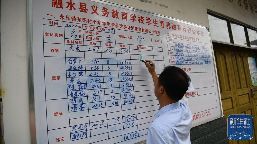 5月20日,在广西融水苗族自治县东阳村小学食堂,校长蓝正立在告示牌上写菜谱。新华社记者 张爱林 摄
