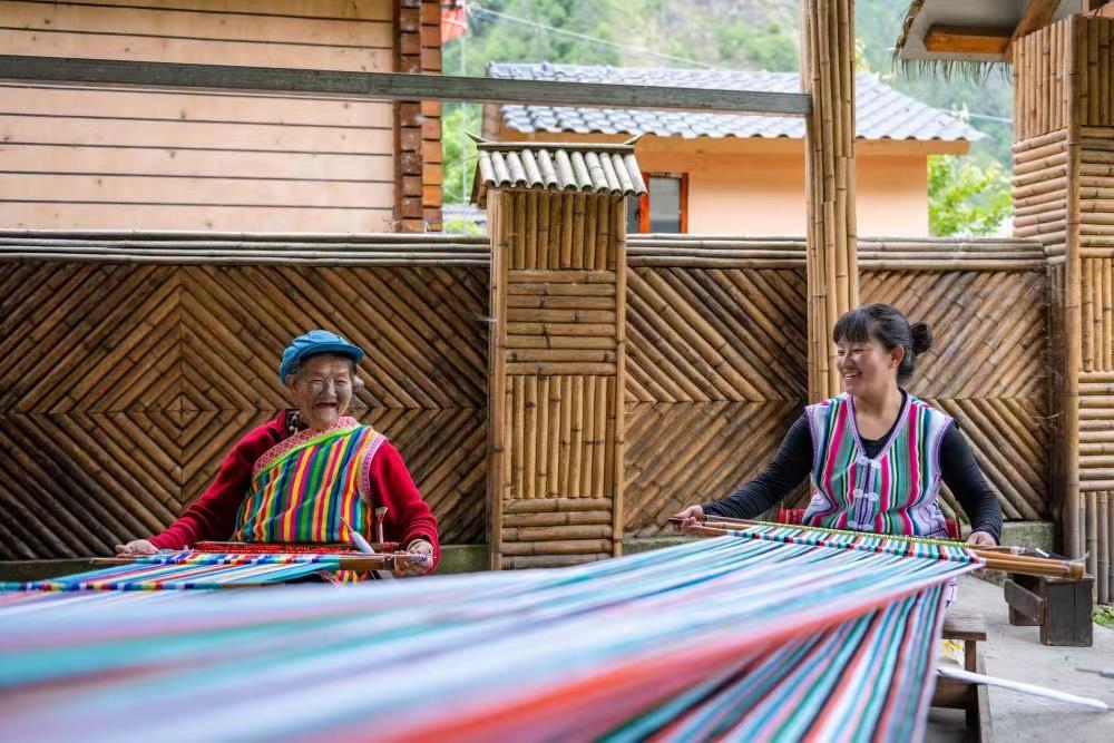 △云南怒江贡山县独龙江乡独龙族老人李文仕(左)和女儿在编织独龙毯。