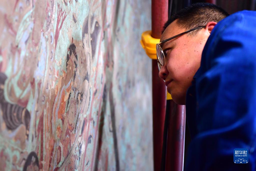 在莫高窟第231窟,敦煌研究院文物保护技术服务中心的壁画修复工作者在修复出现病害的壁画(2022年4月19日摄)。新华社记者 杜哲宇 摄