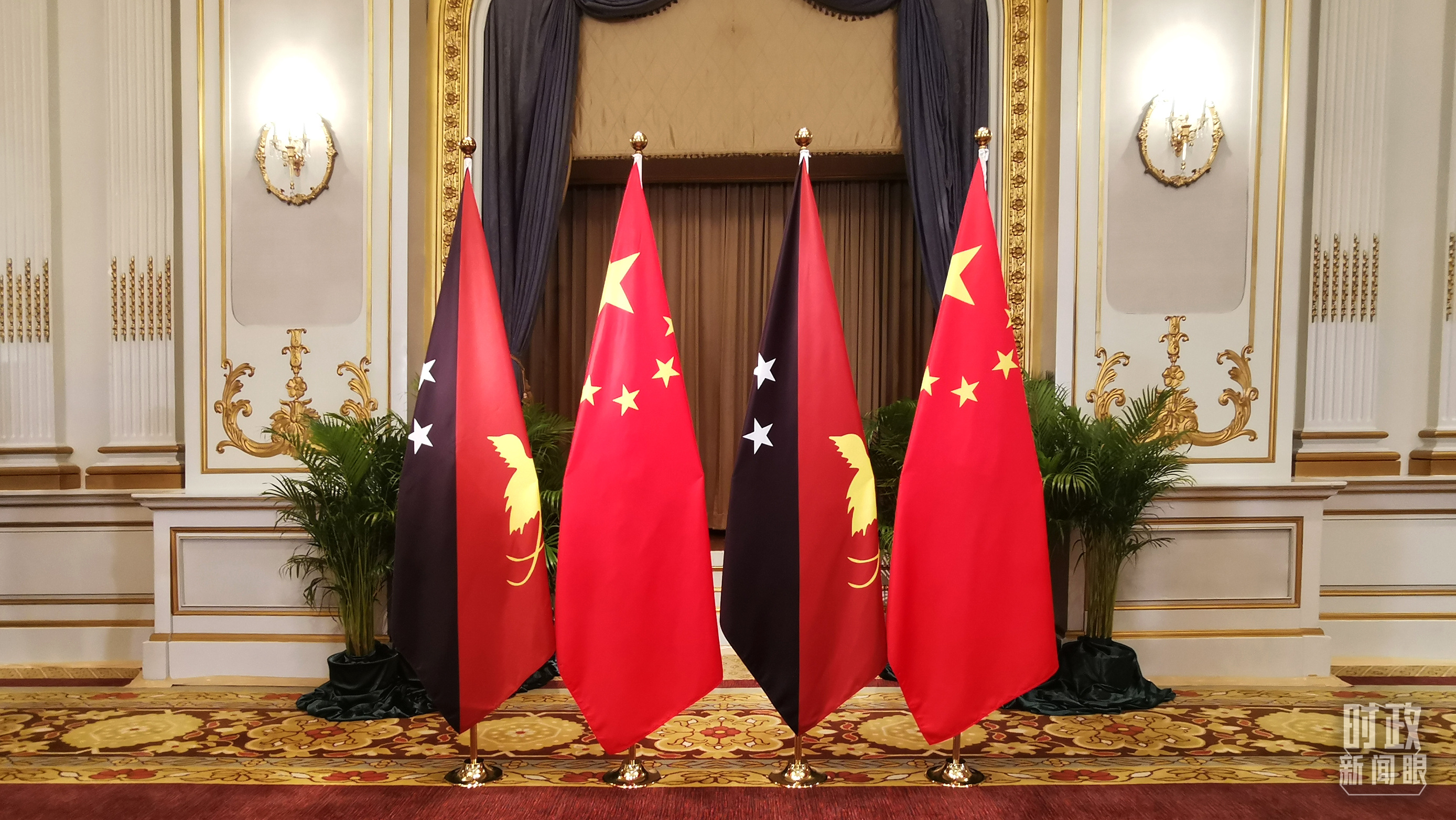 △会见现场的中国与巴新两国国旗。(总台央广记者刘会民拍摄)