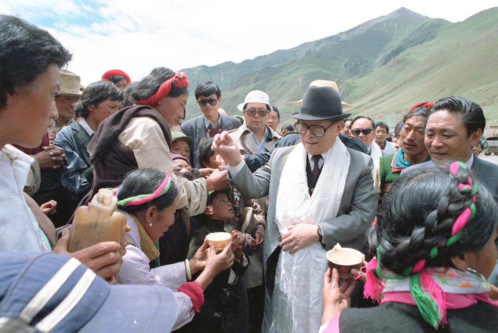 1990年7月25日,江泽民同志与藏族群众共庆望果节。新华社发