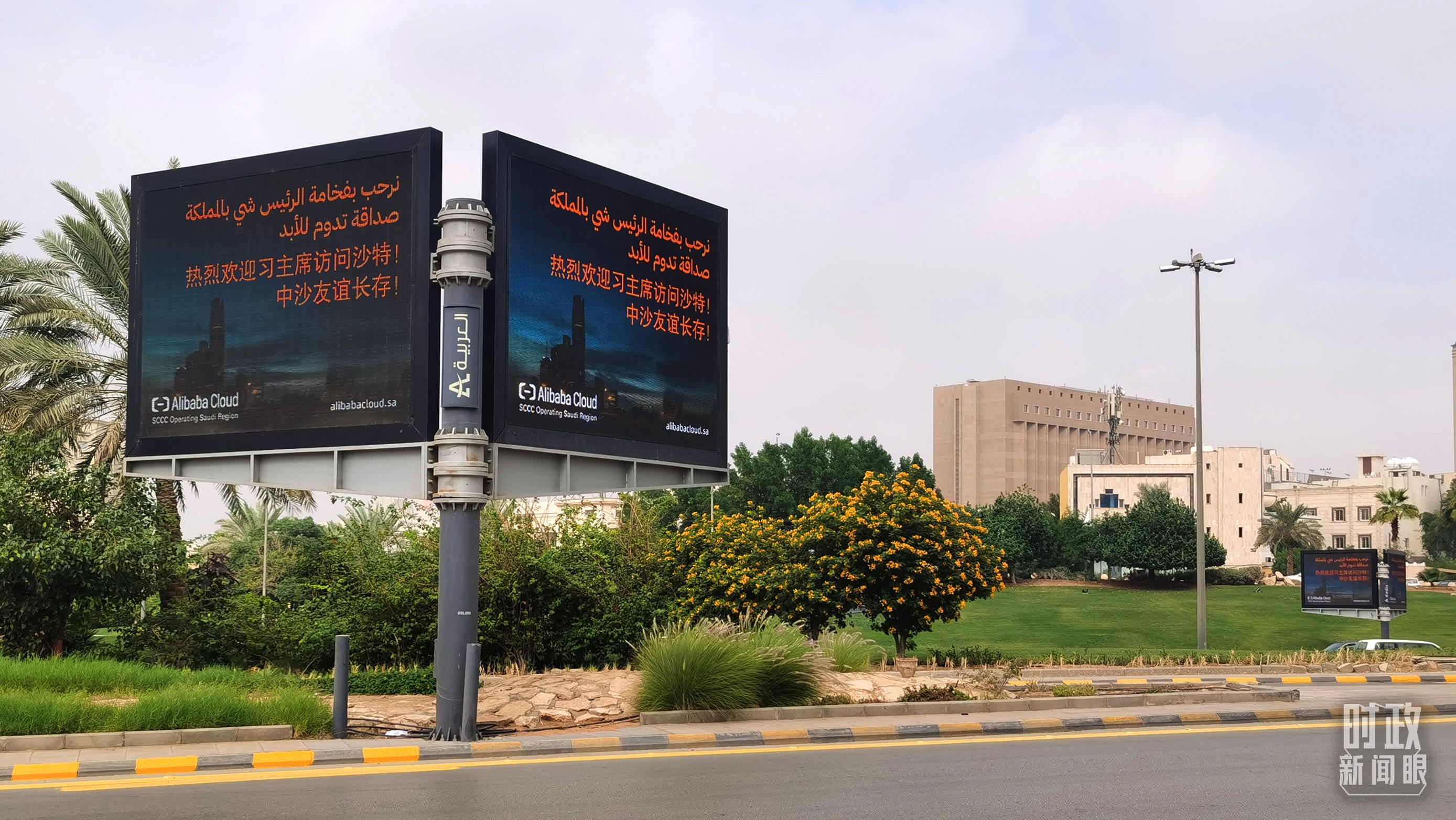 △利雅得,电子屏幕用中文显示“热烈欢迎习主席访问沙特”。(总台央视记者曹亚星拍摄)