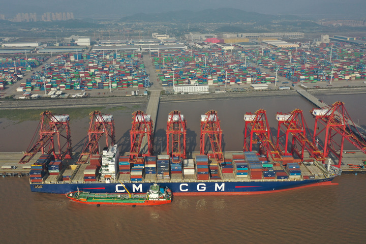 货轮停靠在浙江宁波舟山港梅东码头(12月13日摄,无人机照片)。新华社记者 黄宗治 摄