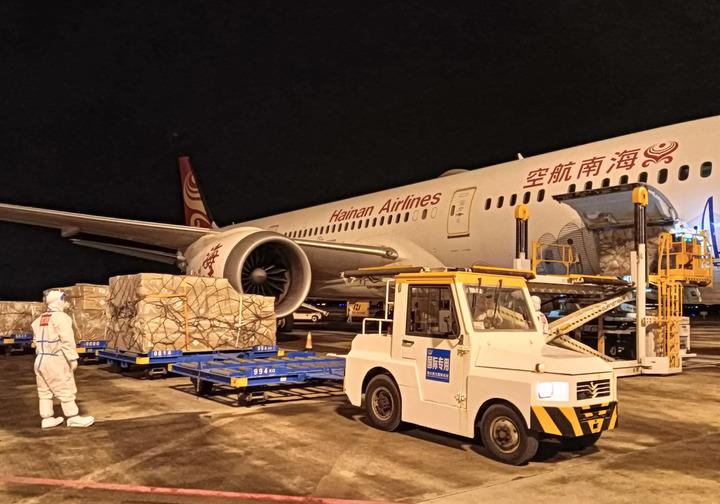 11月24日,海口美兰国际机场的工作人员在停机坪装运货物。次日凌晨,海口—法兰克福客改货定期洲际航线正式恢复。新华社发