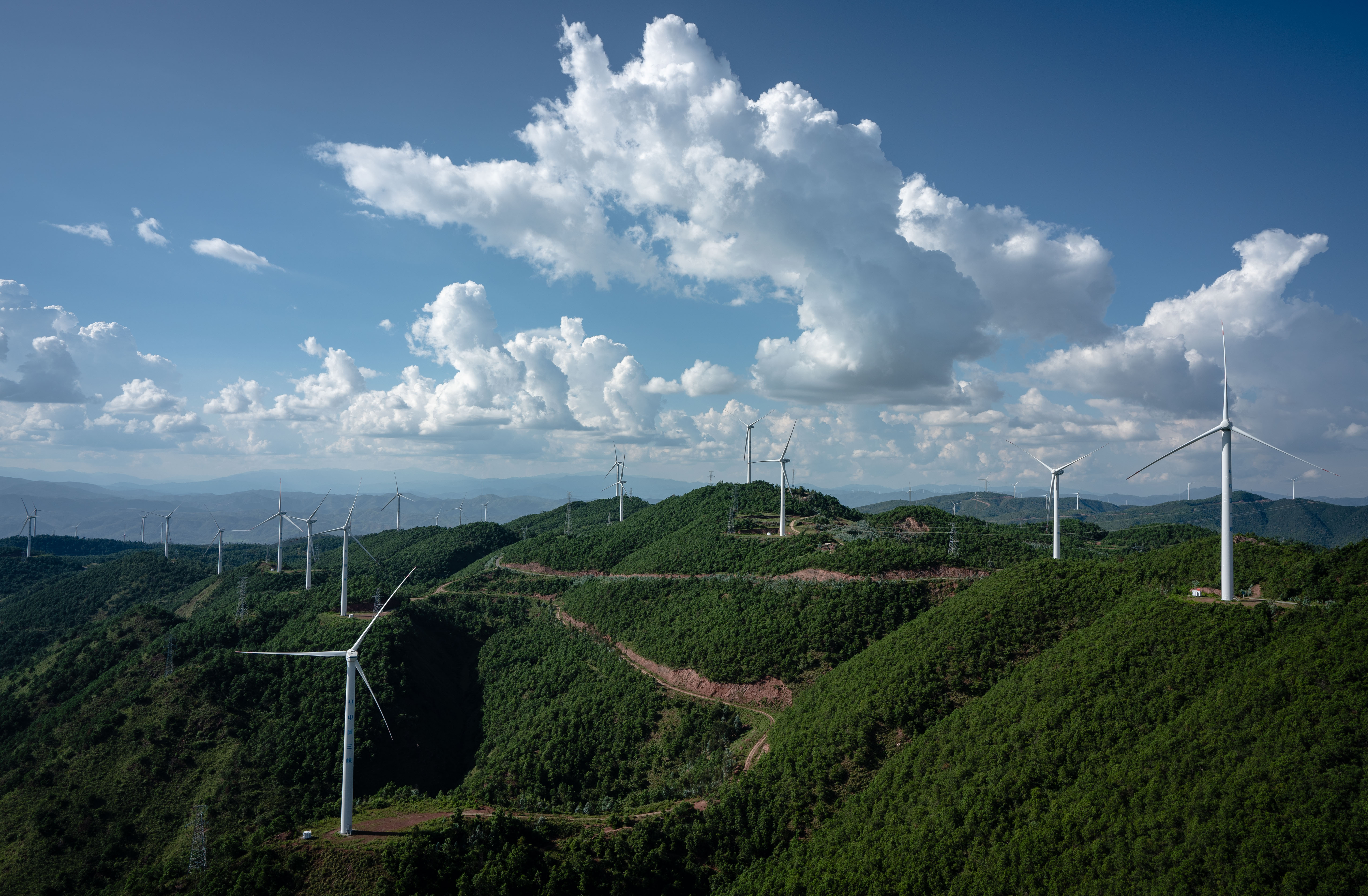 这是2022年8月18日在云南省楚雄彝族自治州姚安县内拍摄的风力发电机。新华社记者 王冠森 摄