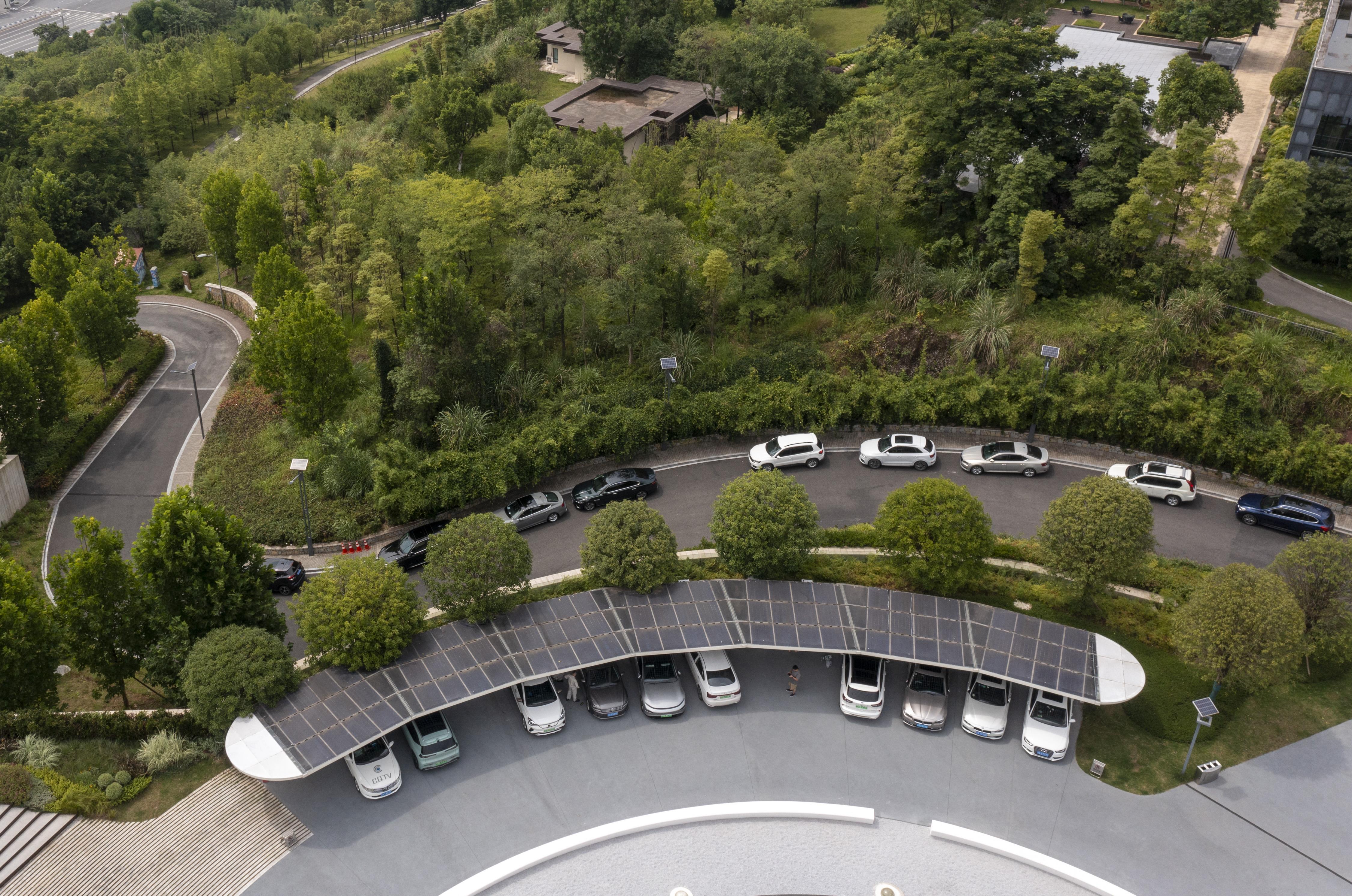 2022年6月16日拍摄的已建成投用的重庆首座光伏充电发用一体充电站(无人机照片)。新华社记者 刘潺 摄