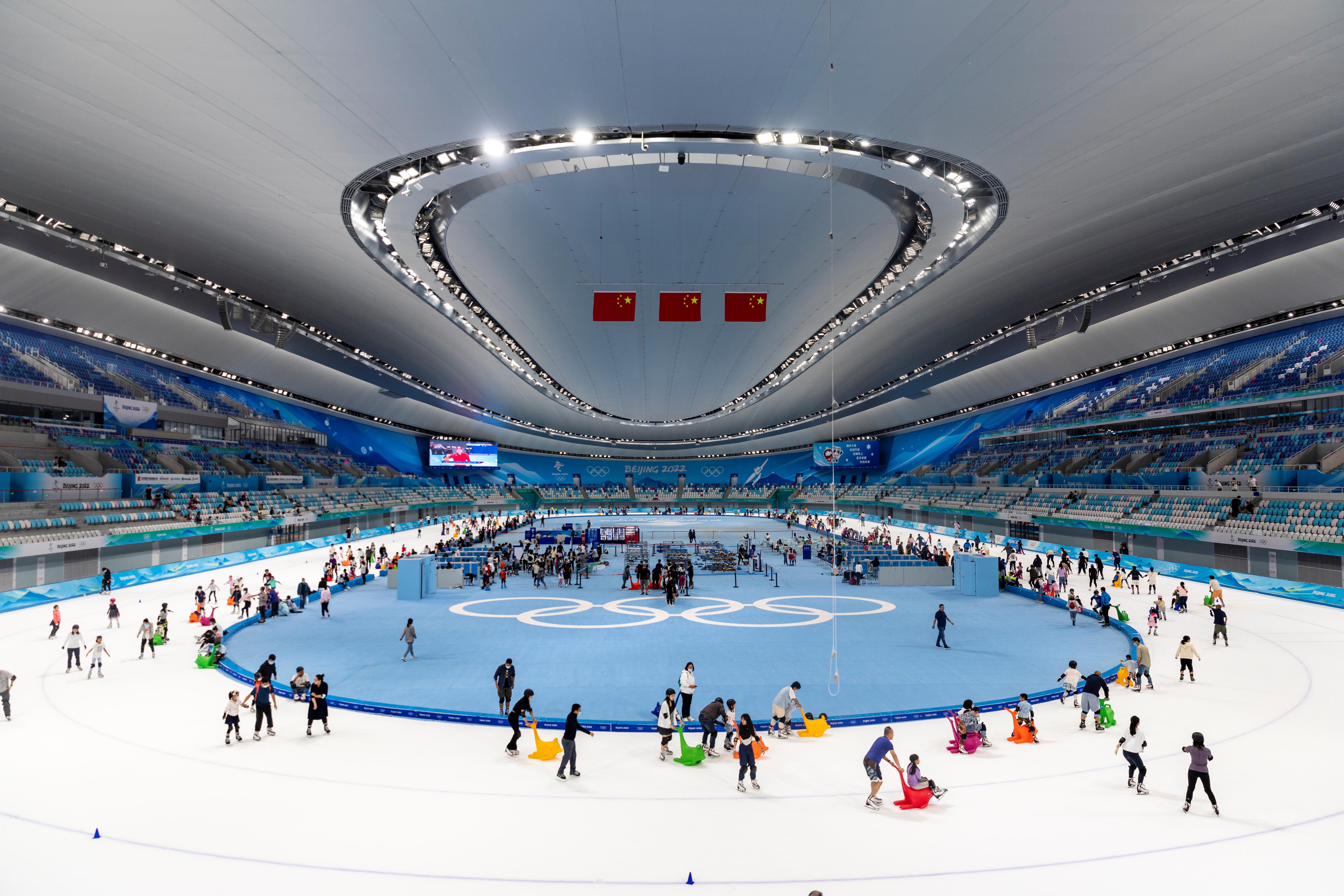 △市民在国家速滑馆“冰丝带”滑冰。