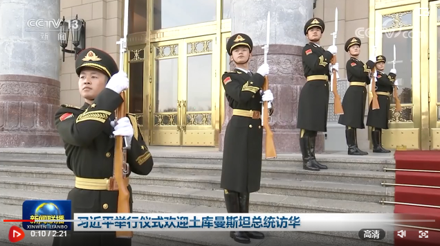 谢尔达尔·别尔德穆哈梅多夫在习近平陪同下检阅中国人民解放军仪仗队。