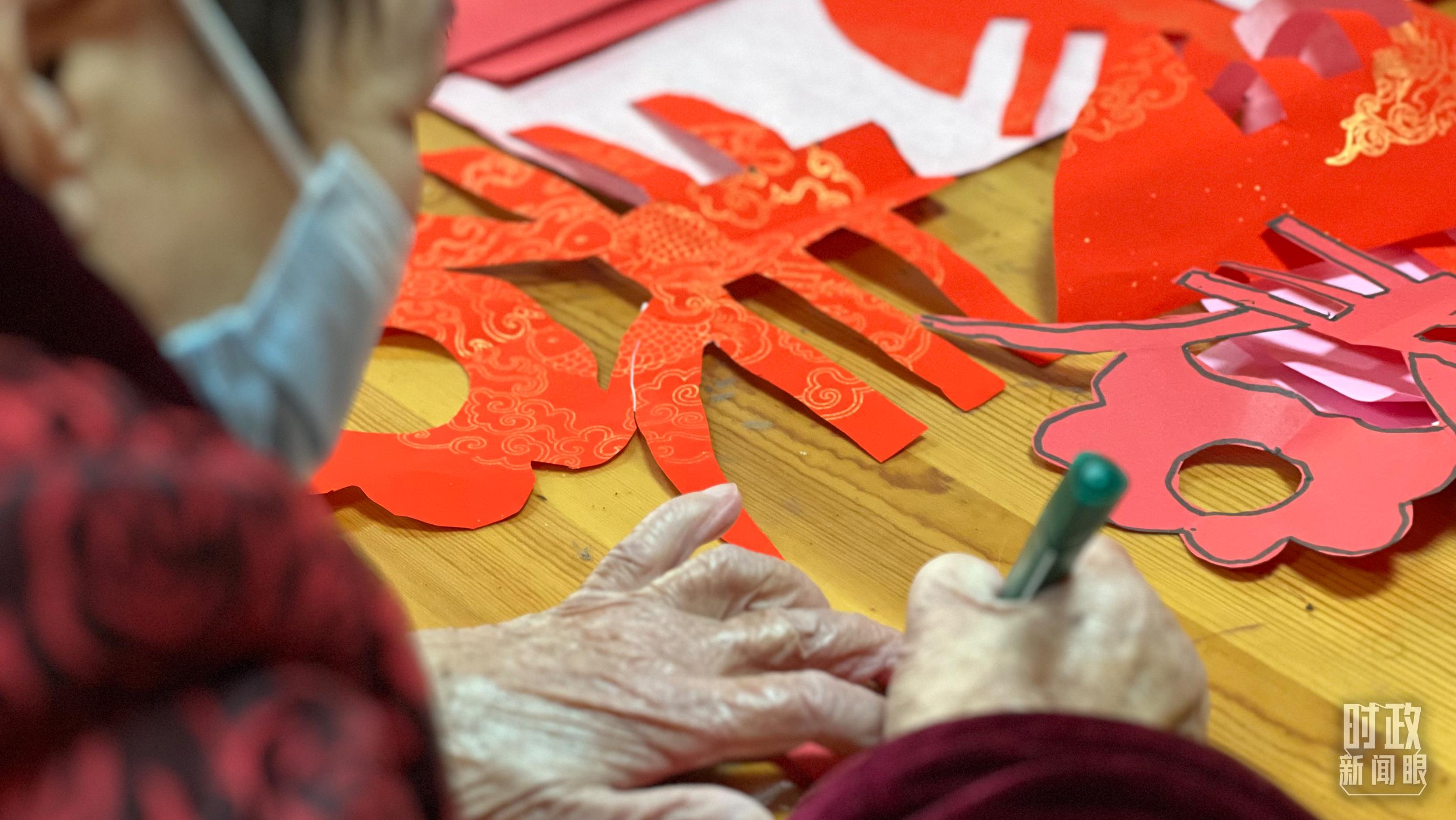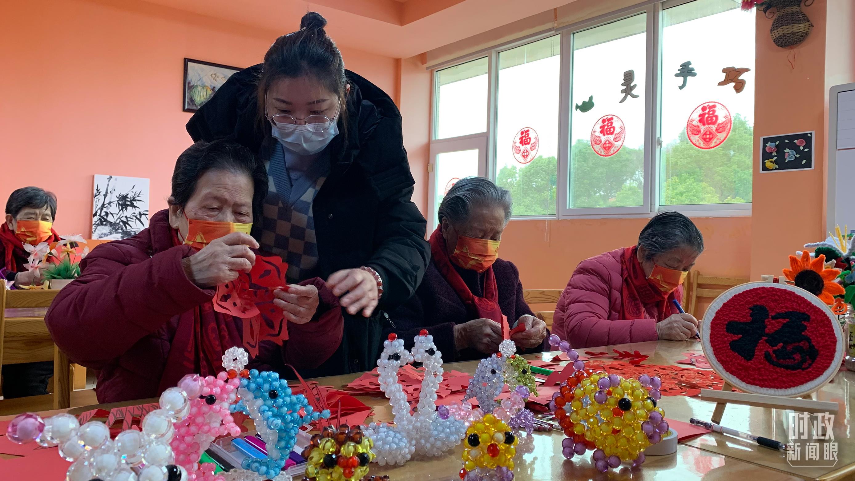 △福利院内,老人们聚在手工室,在社工的指导下完成一件件手工作品。(总台央视记者段德文、李炜拍摄)