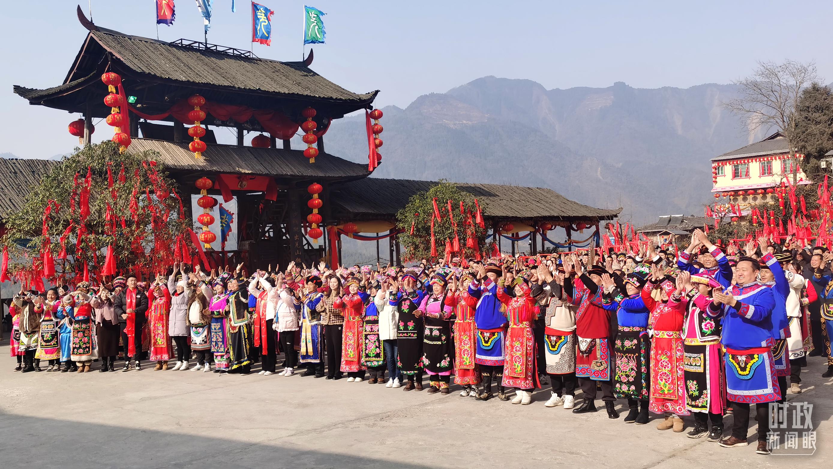 △石椅羌寨村民们给习近平总书记拜年。(总台央视记者关舟拍摄)