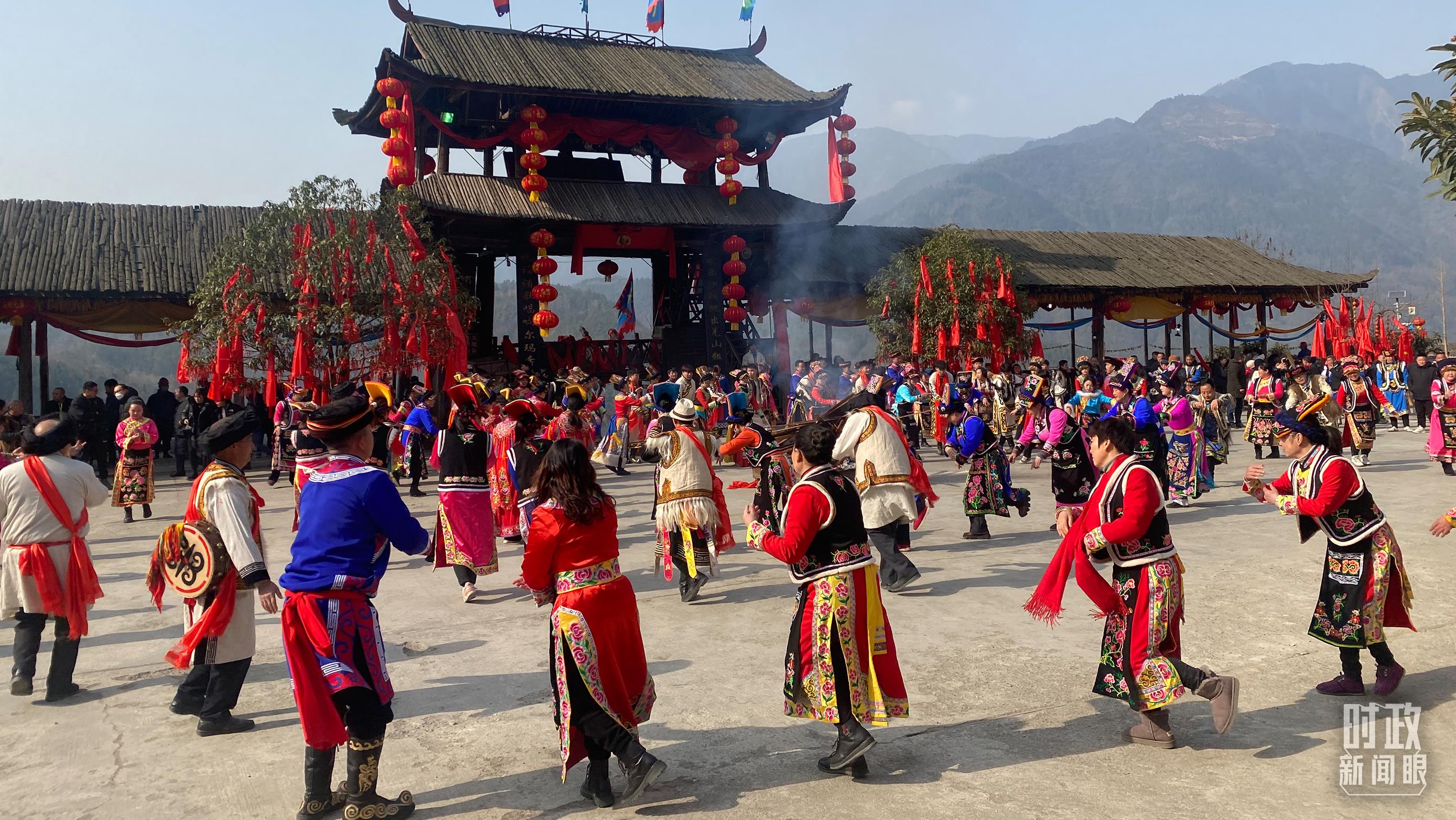 △村民们聚在石椅羌寨文化广场上,跳起沙朗舞,迎接新春。(总台央视记者李增仁拍摄)