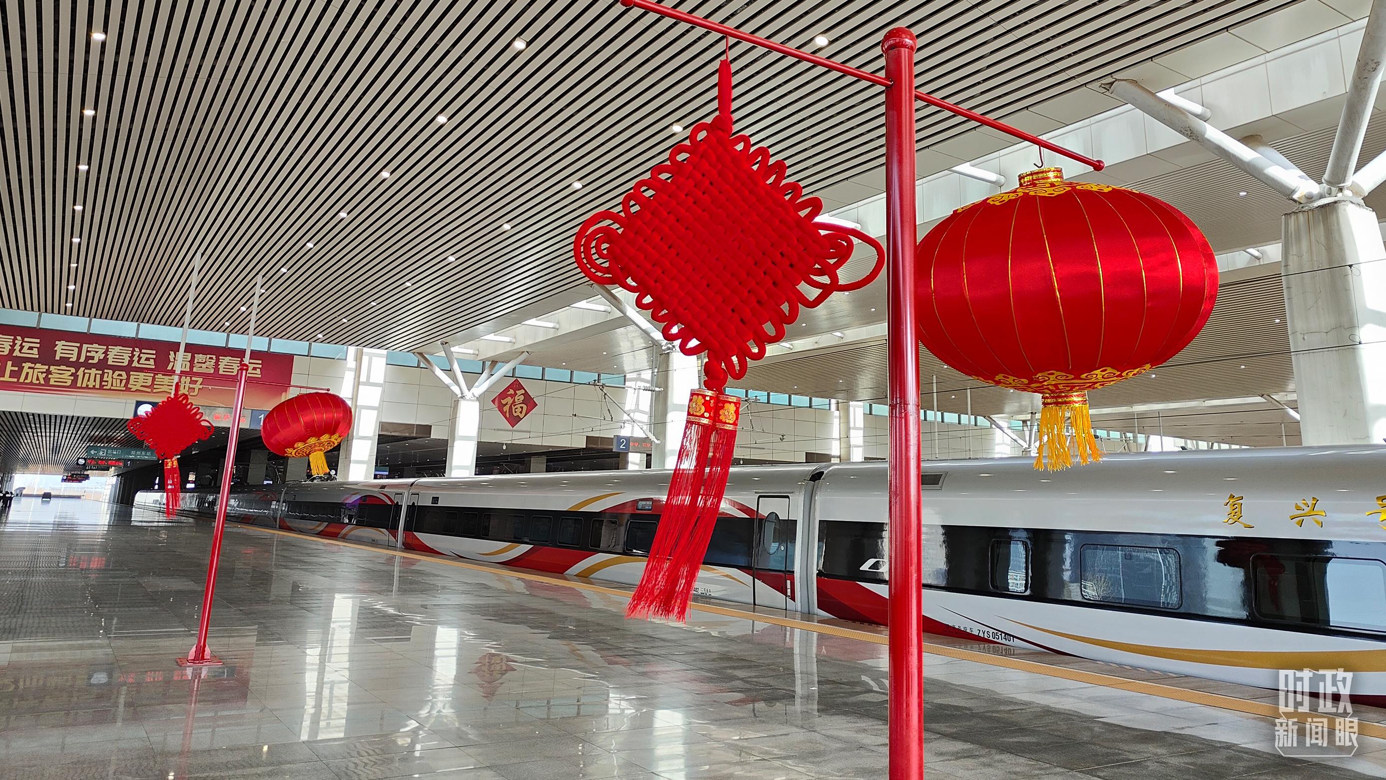 △春节将至,郑州东站站台上悬挂起红灯笼、中国结等。(总台央视记者杨立峰拍摄)