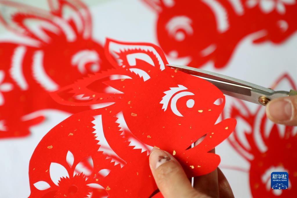 山东省滨州市惠民县李庄镇民间艺人在创作生肖兔剪纸作品(1月13日摄)。新华社发(初宝瑞 摄)