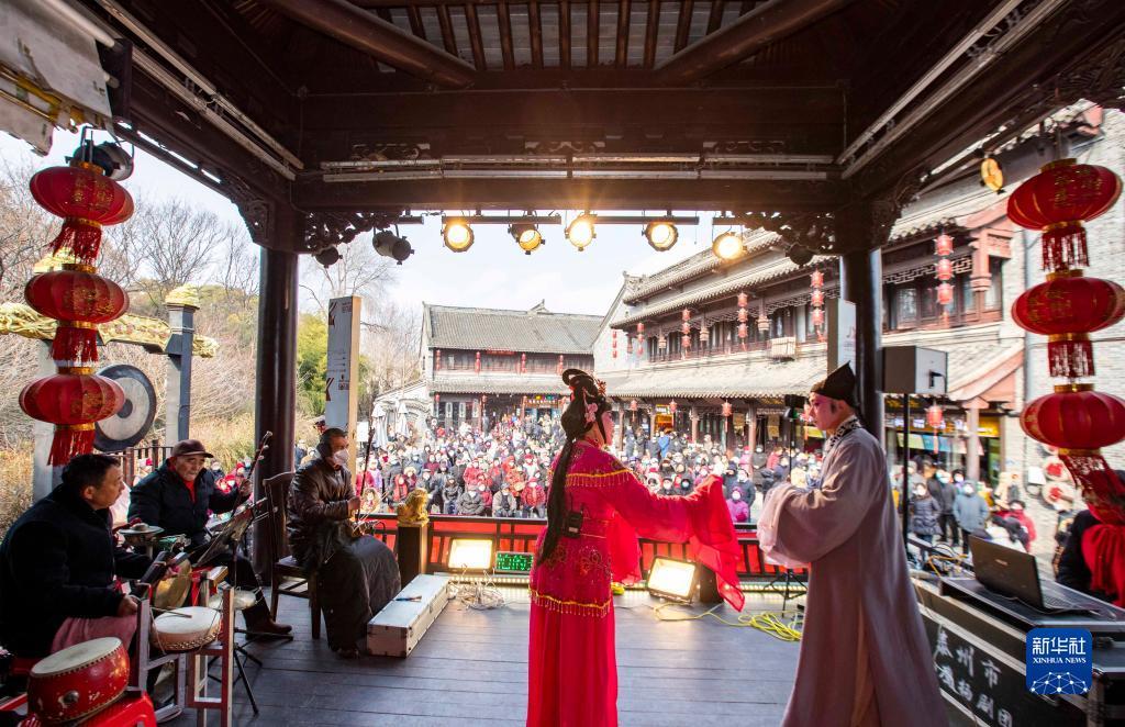 江苏省泰州市海陵区小鹰扬剧团在泰州老街古戏台表演扬剧《珍珠塔·赠塔》选段(1月24日摄)。新华社发(汤德宏 摄)