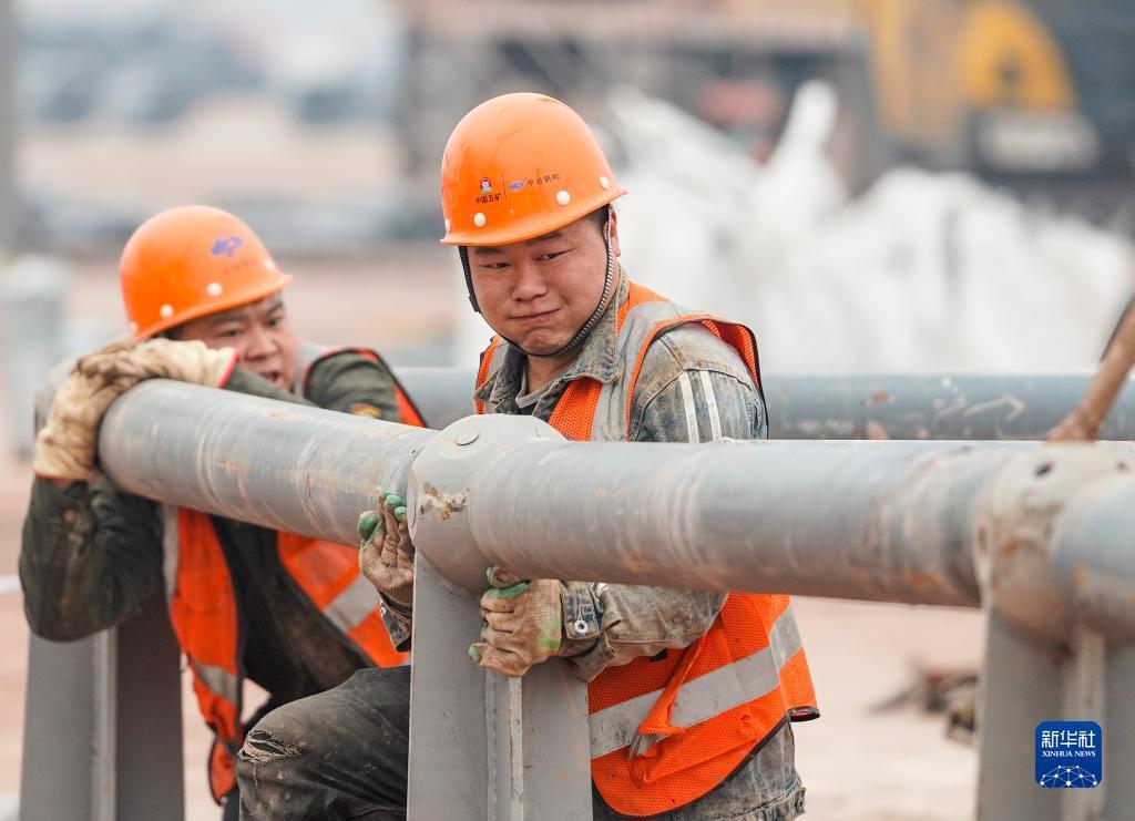 工人在重庆两江新区新能源汽车产业园基础设施配套项目现场进行钢结构材料拼装作业(1月23日摄)。新华社记者 刘潺 摄