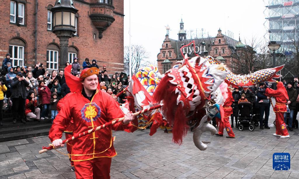 1月21日,人们在丹麦首都哥本哈根市政广场观看舞龙表演。新华社记者 林晶 摄
