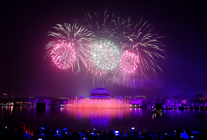 2月5日,西安大唐芙蓉园内进行的烟花晚会现场。新华社记者 刘潇摄