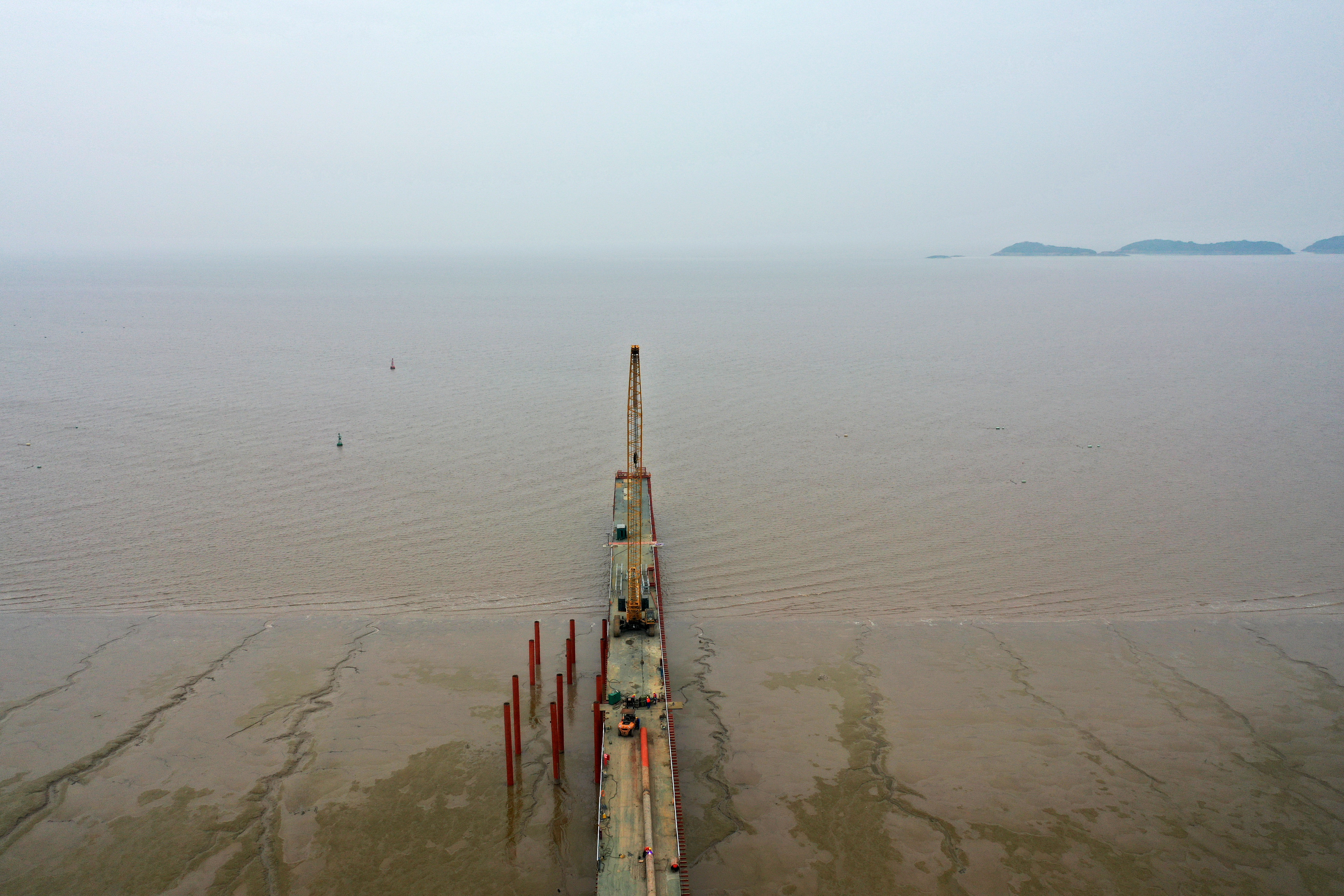 工程人员在通苏嘉甬高铁杭州湾跨海铁路大桥施工现场铺设栈桥,为后期工程做准备(2023年2月1日摄,无人机照片)。2022年11月30日开工建设的通苏嘉甬高铁杭州湾跨海铁路大桥全程跨海,总长约29.2公里,为设计时速350公里的双线高速铁路桥,是目前世界上在建长度最长、建设标准最高的高速铁路跨海大桥。新华社记者 黄宗治 摄