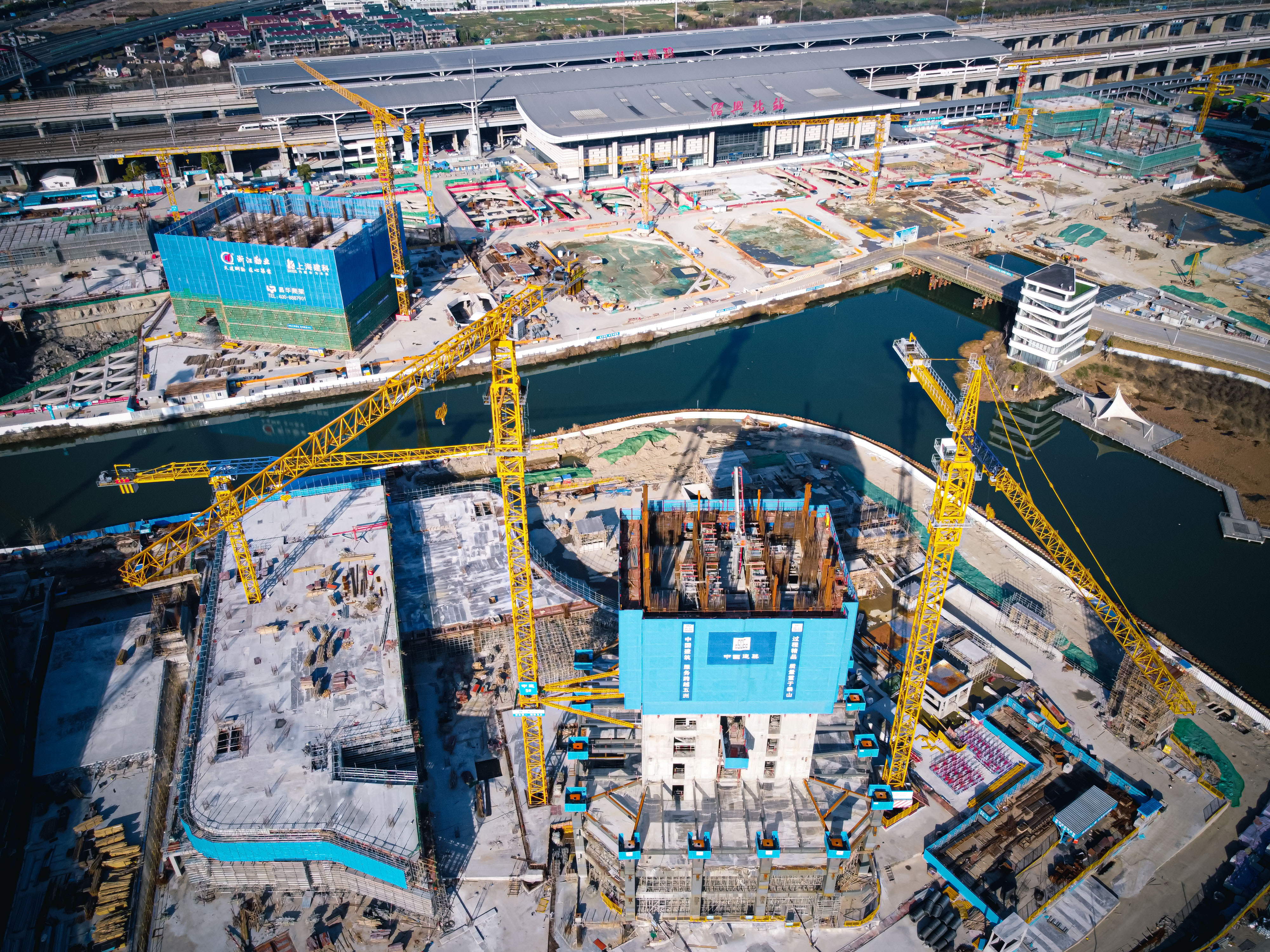 绍兴北站TOD综合交通枢纽工程建设现场(2023年1月31日摄,无人机照片)。由中建三局承建的这项工程为浙江省重点工程,建成后将是集商务办公、科创研发、星级酒店等多重功能于一体的智慧型城市交通综合体。新华社记者 江汉 摄