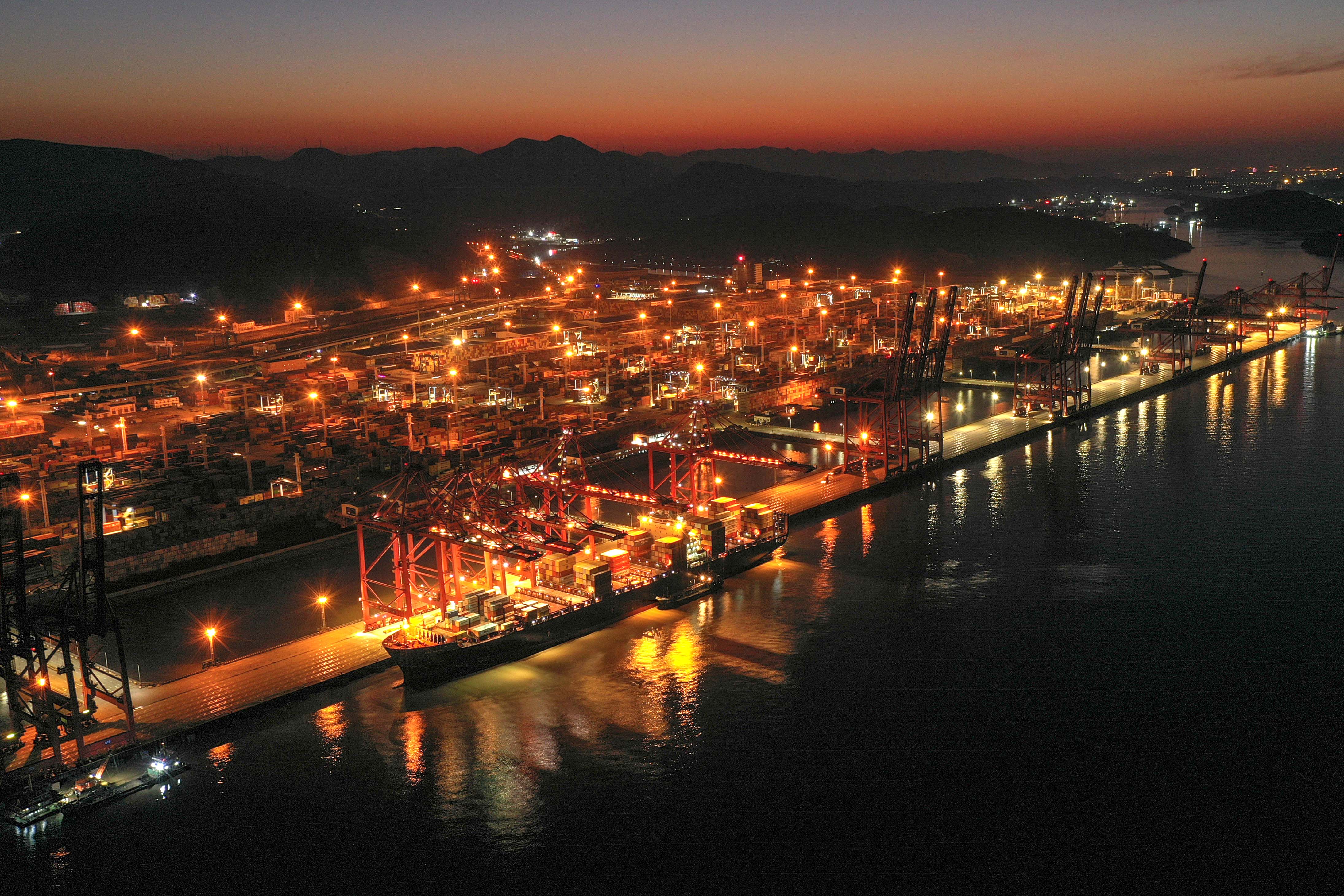 夜幕下,一艘货轮停靠在宁波舟山港穿山港区集装箱码头(2023年1月31日摄,无人机照片)。2022年宁波舟山港完成年货物吞吐量超12.5亿吨,连续14年位居全球第一;完成集装箱吞吐量3335万标准箱,位居全球第三。新华社记者 黄宗治 摄