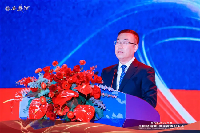 西凤集团公司党委副书记郭拴新致祝酒辞,感谢参会经销商和一直以来给予西凤大力支持的各界朋友,希望与大家携手共进、并肩同行,共同开创西凤事业高质量发展的绚丽篇章。