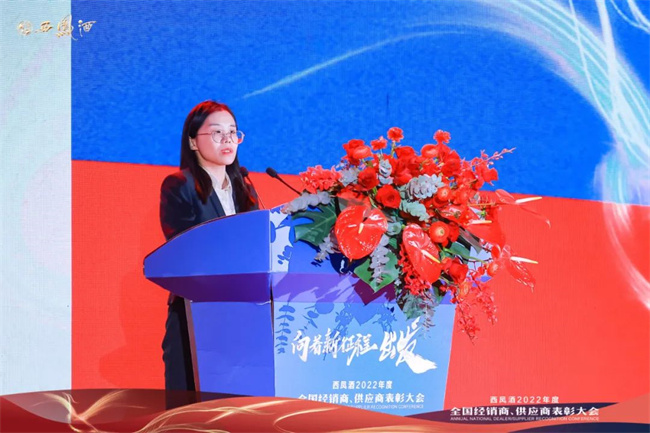 周艳花作题为《强基固本 以高标准引领营销高质量发展,奋揖扬帆 以高效能推进西凤迈上新征程》2022年营销工作总结暨2023年营销工作规划