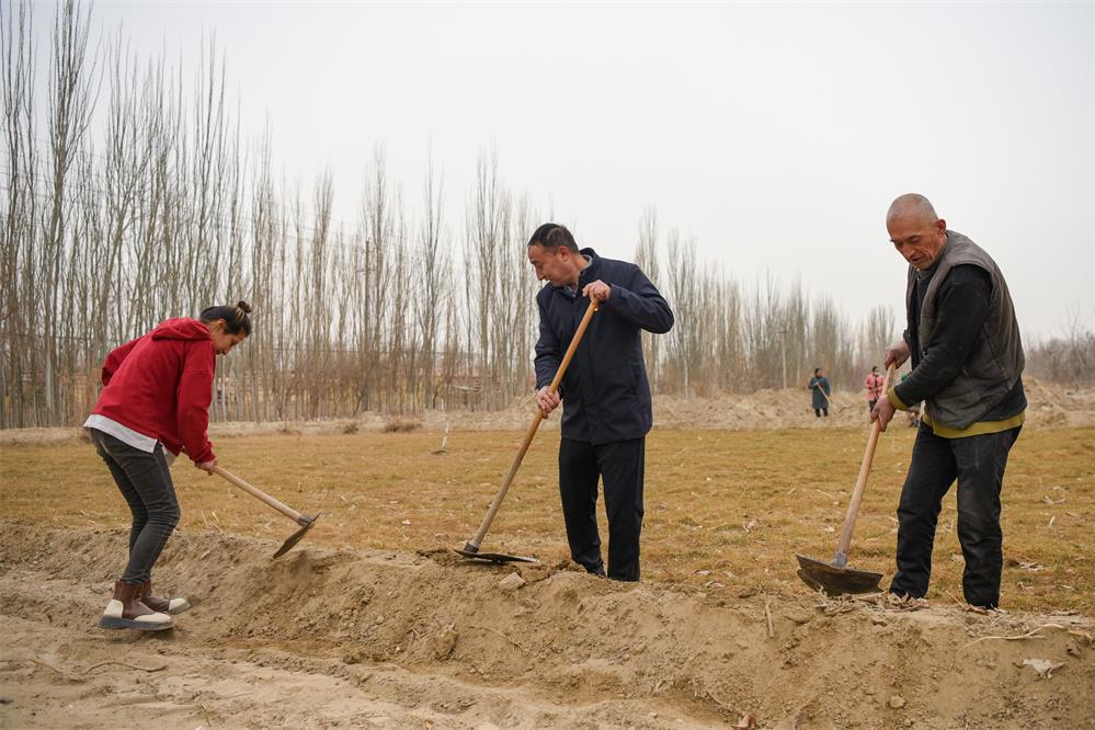 2月20日,在新疆和田地区策勒县巴什玉吉买村,买买提依布热依木·买买提明(中)和村民一起整理土地,为春耕生产做准备。新华社记者 丁磊 摄