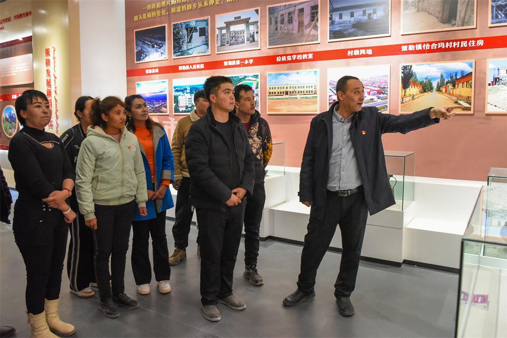 2月20日,在新疆和田地区策勒县巴什玉吉买村的民族团结馆,买买提依布热依木·买买提明(右一)向村里的年轻人介绍策勒县的变化。新华社记者 丁磊 摄