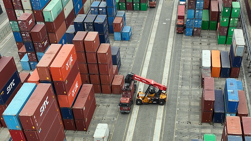 2023年2月15日,工人在广西钦州港集装箱码头驾驶装卸车调运集装箱(无人机照片)。